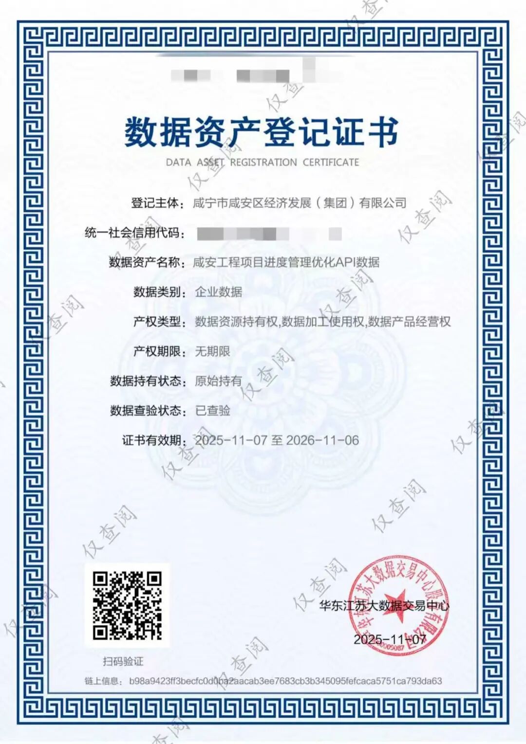 近日,咸寧市咸安區(qū)經(jīng)濟發(fā)展(集團)有限公司順利拿下“咸安工程項目進度管理優(yōu)化API數(shù)據(jù)”數(shù)據(jù)資產(chǎn)登記證書,成為咸安區(qū)首家獲此登記證書的企業(yè)。這一成果的取得,標志著咸安區(qū)落實數(shù)據(jù)要素市場化改革、數(shù)據(jù)資源資產(chǎn)化探索取得突破性進展,在數(shù)據(jù)資源價值挖掘與應(yīng)用進程中邁出的關(guān)鍵一步。